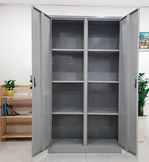 - Tủ sắt gồm 2 khoang lớn, 2 cánh mở độc lập, mỗi cánh có 01 khóa riêng biệt, có 3 bản lề cố định.